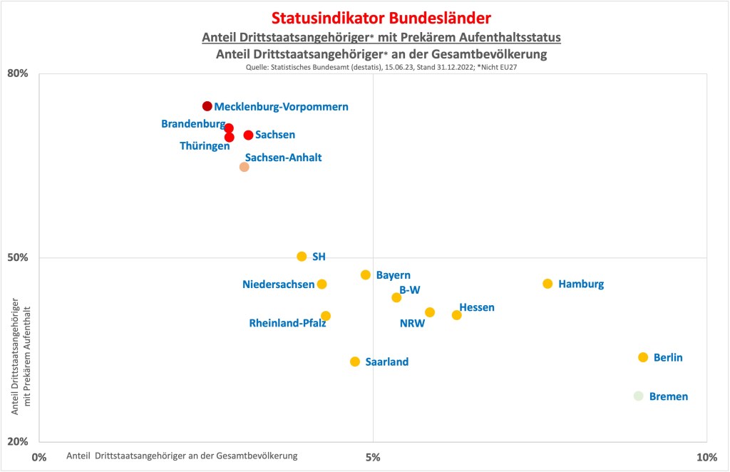 Die rechtlichen Voraussetzungen für eine nachhaltige Integration schafft Deutschland nur für eine Minderheit der Staatsangehörigen aus Drittstaaten außerhalb der EU, während eine große Zahl dieser Zugewanderten aus unterschiedlichen Gründen in einem unsicheren bis prekären Aufenthaltsstatus steckt. Dies ist in den östlichen Flächenländern bis zu dreimal häufiger der Fall als in der alten Bundesrepublik, obwohl der Ausländeranteil aus Drittstaaten dort wesentlich niedriger ist.