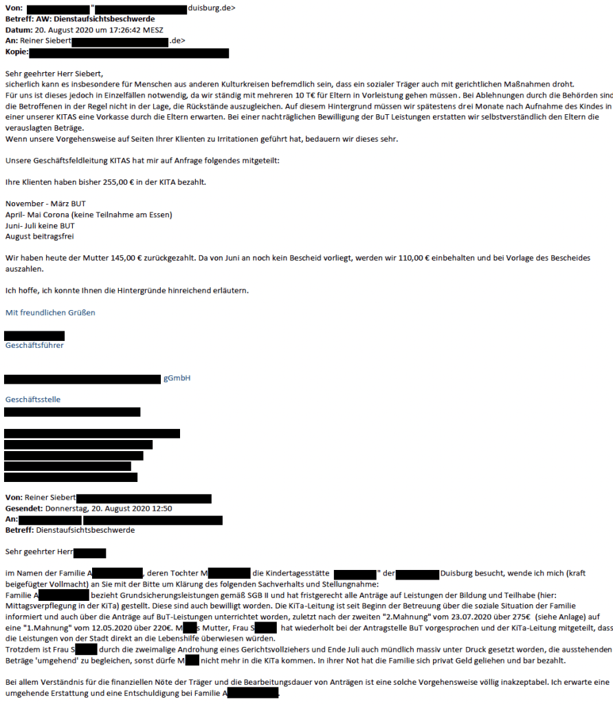Die ‚Aufklärung‘ der Angelegenheit offenbart jedoch Abgründe auf Seiten einer gemeinnützigen Einrichtung, deren selbsterklärter Daseinszweck die Hilfe für Menschen in allen Lebenslagen ist, denn sie erfolgt erst nach einer Dienstaufsichtsbeschwerde an den Geschäftsführer des KiTa-Trägers, in der die unverzügliche Aufklärung des Sachverhalts und eine Stellungnahme eingefordert wird, wieso man Eltern derartig unter Druck setzt.
