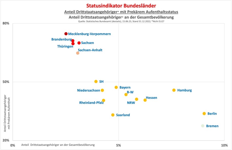 Die Analyse der Ausländerstatistik belegt, dass Drittstaatsangehörige in der Gesamtbevölkerung der Bundesländer sehr ungleich verteilt sind. Im Osten fällt der Anteil mit 2,5-3,1% deutlich kleiner aus als in Ländern der alten Bundesrepublik, während gleichzeitig deutlich weniger Zugewanderte aus Drittstaaten zumindest über einen befristeten Aufenthaltstitel verfügen. Die niedrige Bevölkerungsquote in den östlichen Flächenländern geht bei gleicher Gesetzesgrundlage des Aufenthaltsrechts und Zuständigkeit der kommunalen Ausländerbehörden nicht etwa mit einer schnelleren Bearbeitung von Anträgen oder auch mehr Rückführungen einher.