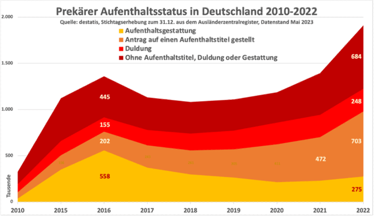 Ende 2022 leben in Deutschland fast 2 Millionen Menschen aller Altersgruppen ohne einen Aufenthaltstitel und somit in einem prekären Aufenthaltsstatus, der mit zum Teil erheblichen Einschränkungen ihrer Grund- und Bürgerrechte einhergeht. Im Vergleich zu 2016 entspricht dies einem Anstieg um 40%. Seit 2010 hat sich die Zahl sogar versechsfacht.