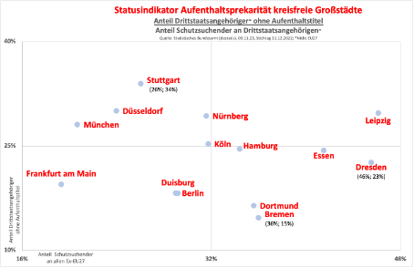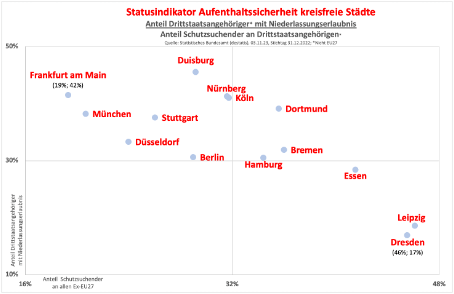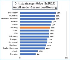 Ein Vergleich unter den 15 Großstädten über eine halbe Million Einwohnern bestätigt, dass die beiden ostdeutschen Großstädte Dresden und Leipzig über den niedrigsten Anteil an Drittstaatsangehörigen an der Gesamtbevölkerung wie auch über die geringste Quote an Drittstaatlern mit dauerhafter Integration verfügen.