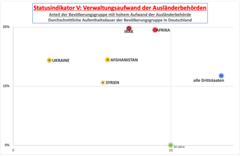 Mehr als 10% aller Drittstaatler befindet sich in einem mehr oder weniger kontinuierlich schwebenden Verfahren der Ausländerbehörden, bei Staatsangehörigen aus afrikanischen Staaten oder dem Irak ist es sogar fast jeder Fünfte. Diejenigen unter ihnen mit Duldungsstatus müssen von den Kommunen auch dann noch untergebracht und versorgt werden, wenn sie bereits seit vielen Jahren in Deutschland leben.