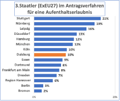 Der Anteil der Drittstaatler im Antragsverfahren ist jedoch in Leipzig mehr als doppelt so groß wie in Dresden und variiert unter den 15 Städten zwischen 2% in Bremen und 21% in Stuttgart erheblich.