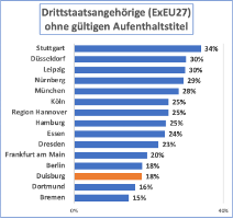 Auch der Anteil der Menschen ohne Aufenthaltstitel unterscheidet sich erheblich. Während in Stuttgart jeder Dritte gemeldete Drittstaatler nicht über einen Aufenthaltstitel verfügt, ist es in Bremen nur jeder Sechste oder Siebte.