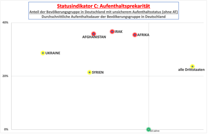 Richtet man die Aufmerksamkeit auf Bürgerinnen und Bürger aus Drittstaaten ohne einen Aufenthaltstitel, also gewissermaßen ans untere Ende der Statusskala, zeigt sich, dass nahezu ein Viertel aller Personen aus Drittstaaten nicht über einen Status verfügen, der ihnen Grundrechte und Teilhabe zumindest befristet sichert, obwohl sich die Gesamtheit dieser Gruppe im Durchschnitt bereits über 13 Jahre in Deutschland aufhält. Bei Staatsangehörigen aus afrikanischen Staaten, Irak und Afghanistan ist der unsichere Aufenthaltsstatus bei mehr als einem Drittel und damit besonders häufig anzutreffen, obwohl die durchschnittliche Aufenthaltsdauer länger ist als bei Menschen aus Syrien oder der Ukraine.