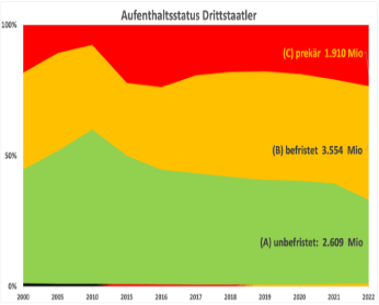 Aus den Gesamtzahlen aller Drittstaatler[6] im Ausländerzentralregister lässt sich eine nennenswerte aufenthaltsrechtliche Aufstiegsmobilität nicht ableiten, denn die Betrachtung der Statusgruppen im Zeitverlauf zeigt, dass sich langfristig die Zahl derer mit unbefristeter Niederlassungserlaubnis seit mehr als 20 Jahren absolut nur marginal erhöht hat (von 2,3 Mio 2000 auf 2,6 Mio Ende 2022). Der Anteil dieser aufenthaltsrechtlich als voll integriert geltenden Drittstaatler ist aber seit 2010 von über 50% auf knapp ein Drittel kontinuierlich gesunken, während der Anteil jener mit unsicherem Aufenthalt sich seit 2016 nur vorübergehend und unwesentlich verringert hat (bei einem deutlichen Anstieg in den absoluten Zahlen, wie oben ausgeführt).